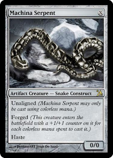 This is the actual wording of Machina Serpent. (I had to hide the keyword before.) Forged was created when I was attempting to find another colorless keyword for a set I was working on. Machina Serpent shows off both abilities quite well. When I was creating cards for these keywords, there seemed to be a large number of creatures that could have either ability, for example:
