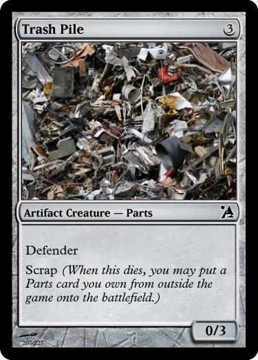 The thing about this is it needs another type of card to make it awesomer. (Is awesomer a word?) Parts should be at all rarites, and there should be at least one that has no mana cost so you can grab it from your sideboard, but can't actually cast it. That one should not be common, but uncommon is probably fine. Here's an example of one that you might play in your deck if you don't have many scrappable creatures (or other artifacts?).